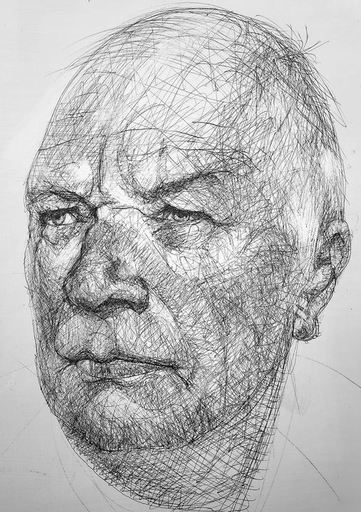 De portretten en dierfiguren ontstaan uit een dialoog tussen structuur en toeval: het precieze van de lijn tegenover het onvoorspelbare van stromend pigment.