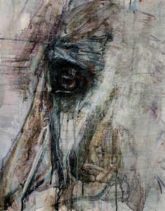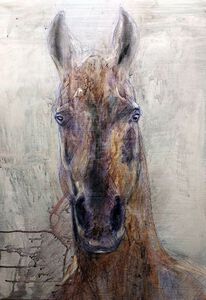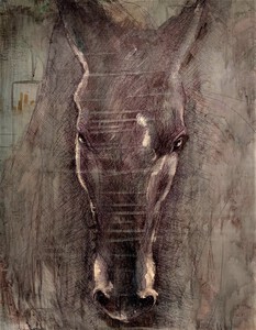 2025Een paard in profiel, half opgelost in mist en verf.